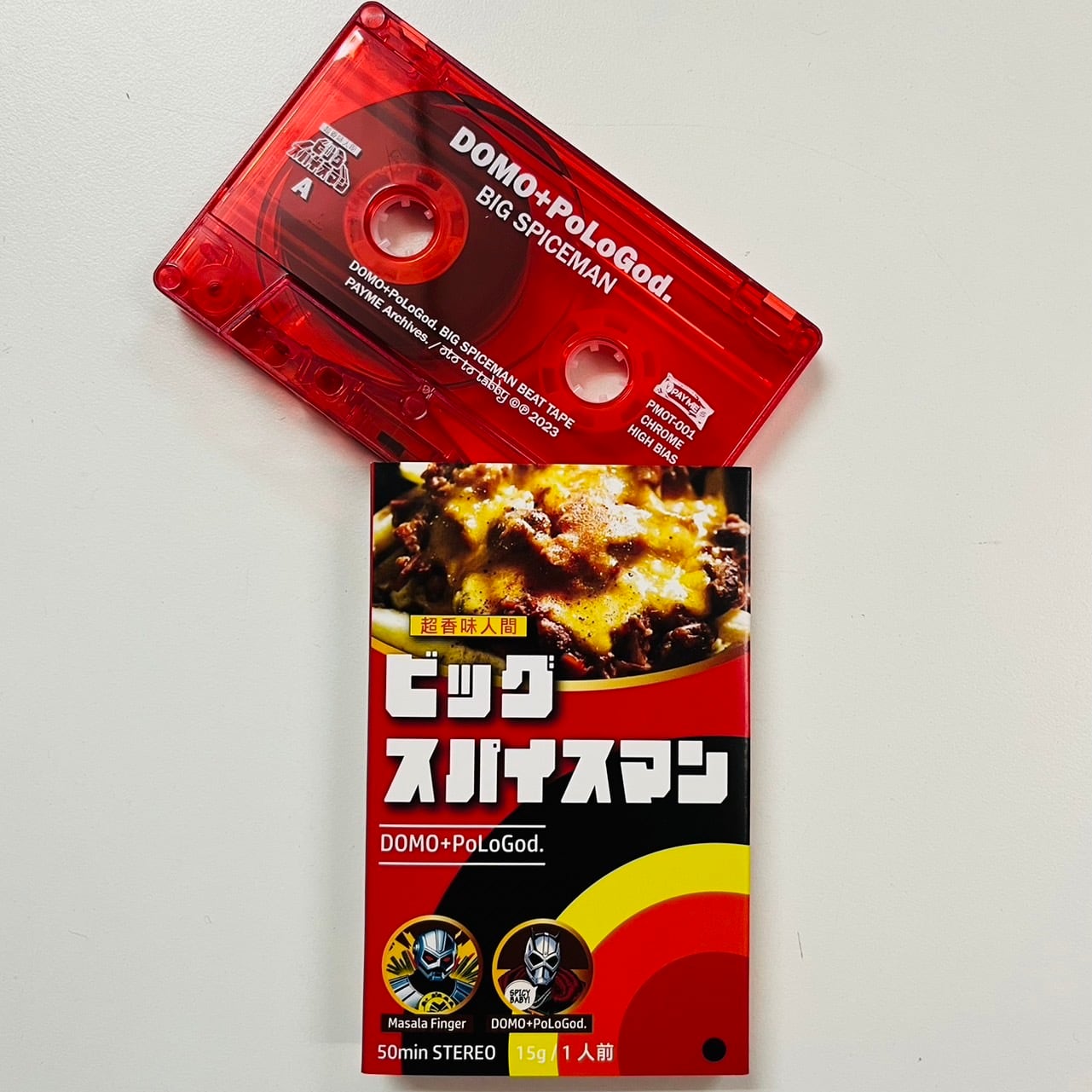 膨大なレコード・ライブラリーの中から厳選し調理されたインストルメンタル、50minはまるでアニメ・サウンドトラックの様な仕上がりとなり、DOMO+PoLoGod.のサンプリングミュージック、機材(ISLA S2400)愛を存分に味わう事ができる。カセットプレイヤーの再生ボタンを押した瞬間からあなたも”超香味人間 BIG SPICEMAN”のバッチリアツい世界へ引きずり込まれることになるだろう。